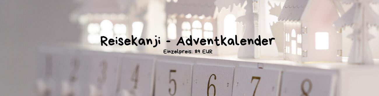 Du möchtest dich für deine Japanreise vorbereiten? Dann ist dieser neue Adventkalender perfekt für dich! Mit diesem Kurs lernst du die 31 wichtigsten Schriftzeichen für deine Japan Reise. Du bekommst von mir zwischen 1. und 31. Dezember jeden Tag ein 2-15-minütiges Video (manchmal ein bisschen länger) zu jeweils einem Kanji, seinen Lesungen, der richtigen Strichfolge und Wissenswertem zur Sprache und Kultur. Zusätzlich bekommst du Beispielsätze für alle Kanji UND die Grammatikerklärungen, die du brauchst, um diese Sätze zu verstehen!